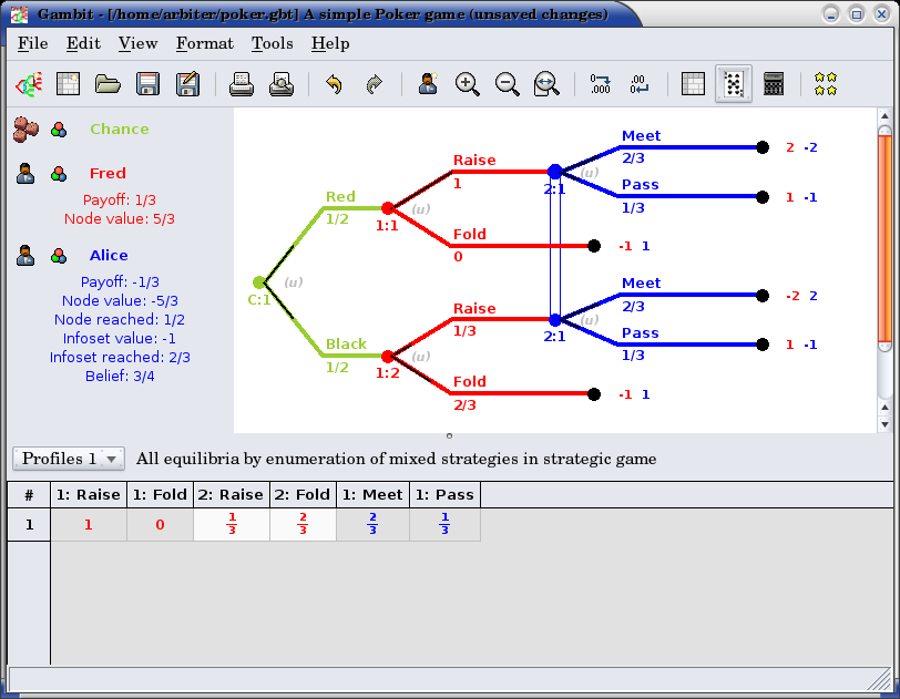 The computed profiles can also be viewed in the reduced strategic game. Clicking on the strategic game icon changes the view to the reduced strategic form of the game, and shows the equilibrium profiles converted to mixed strategies in the strategic game.