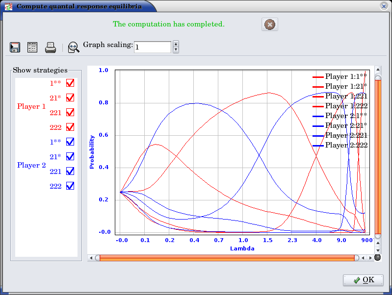 There is an experimental graphing interface for quantal response equilibria in strategic games. The graph by default plots the probabilities of all strategies, color- coded by player, as a function of the lambda parameter. The lambda values on the horizontal axis are plotted using a sigmoid transformation; the Graph scaling value controls the shape of this transformation. Lower values of the scaling give more graph space to lower values of lambda; higher values of the scaling give more space to higher values of lambda.