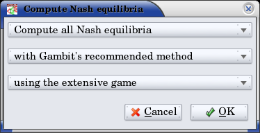 To simplify this process of choosing the method to compute equilibria in the second drop-down, Gambit provides for any game “recommended” methods for computing one, some, and all Nash equilibria, respectively. These methods are selected based on experience as to the efficiency and reliability of the methods, and should generally work well on most games. For more control over the process, the user can select from the second drop-down in the dialog one of the appropriate methods for computing equilibria. This list only shows the methods which are appropriate for the game, given the selection of how many equilibria to compute. More details on these methods are contained in CLI.