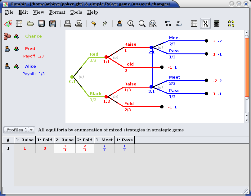This game has a unique equilibrium in which Fred raises after Red with probability one, and raises with probability one-third after Black. Alice, at her only information set, plays meet with probability two- thirds and raise with probability one-third.