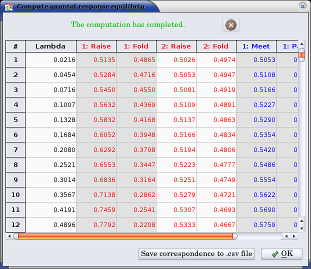 The data points computed in the correspondence can be viewed (as in the extensive game example above) by clicking on the show data icon on the toolbar. The data points can be saved to a CSV file by clicking on the .